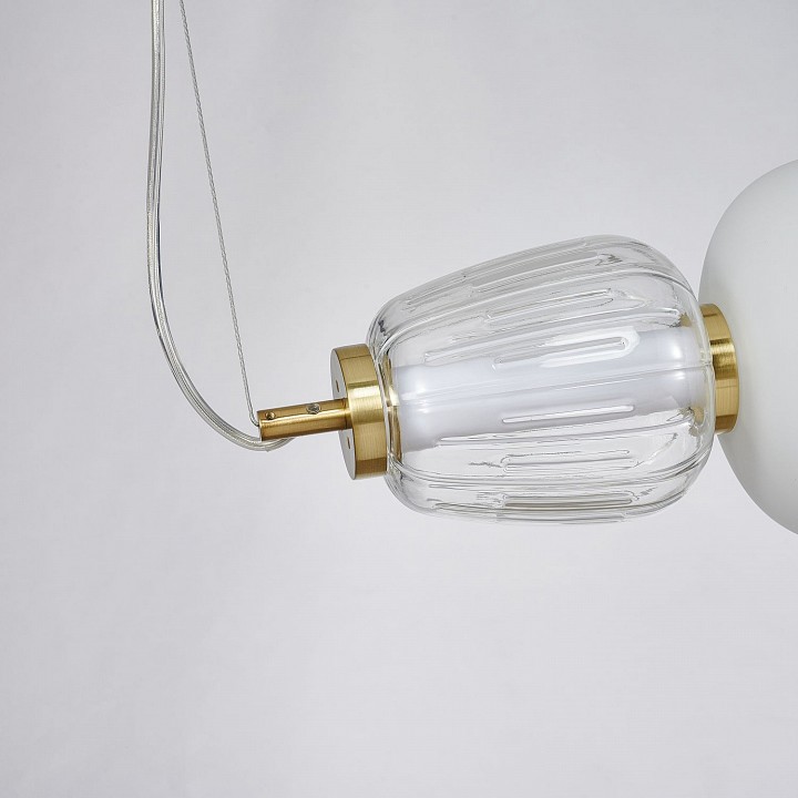 Металлический каркас цвета золота, плафоны в виде бусин разнообразных форм из выдувного стекла двух видов - прозрачного и цвета опала, часть каркаса фиксируется тросиком для баланса. Чередование стеклянных плафонов разной формы, цвета и рисунка, а также цветовое решение каркаса в золоте создает насыщенный сложный и дорогой образ. Плафоны из стекла выдуваются вручную